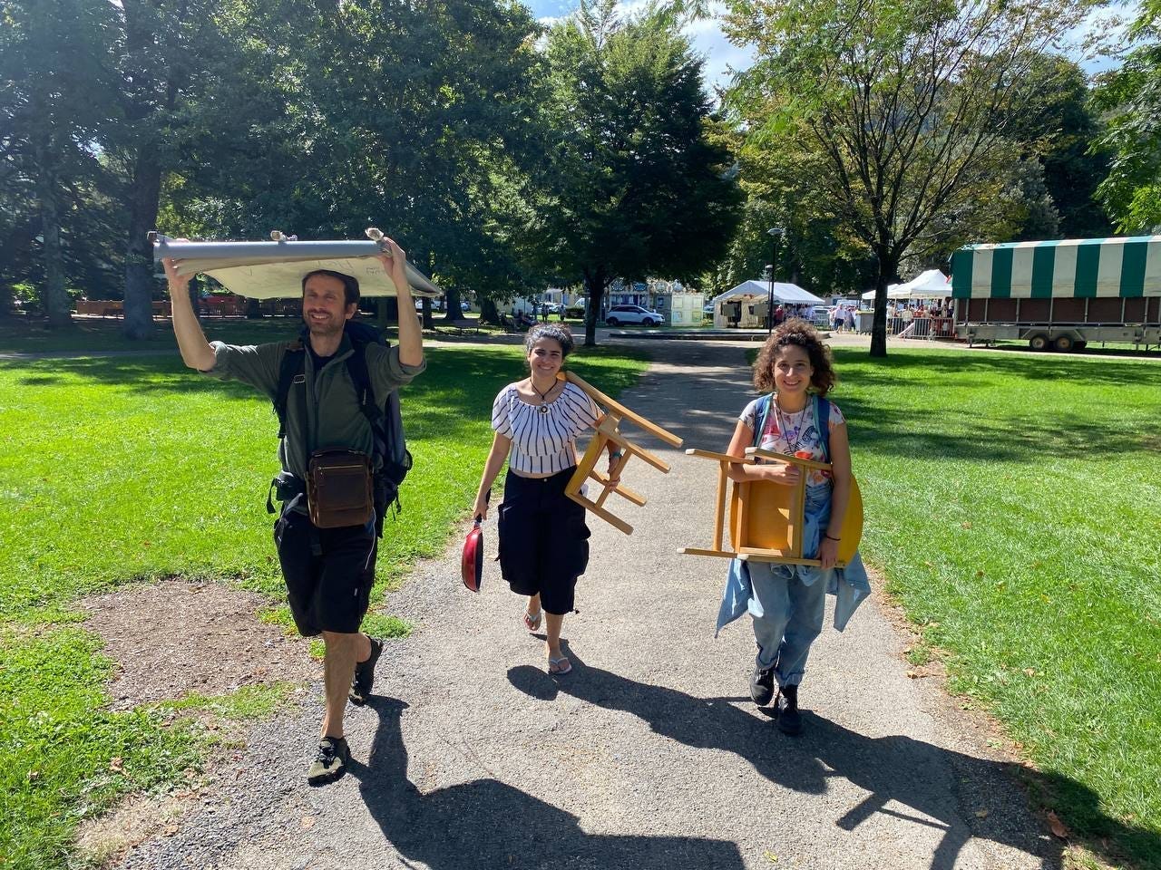 Au début de notre expérience, en pliant nos affaires et en mettant mon paper board sur ma tête pour relâcher la charge, je me suis souvenue de l’agitation, de l’excitation et aussi de la peur d’être vu. “Les regards et les hésitations au sein du groupe. La résistance était dans l’air. Daphné grimaçait, Leonhard était dans cette agitation, excité à l’idée de sortir et aussi prêt à mettre un masque sur son visage malgré la volonté de partir en exploration — sans parler français ! — Je sentais l’isolement et j’étais tenté d’y entrer, une grotte de Gremlin que je connais si bien, me recroquevillant dans des mondes imaginaires pour ne pas être vu.